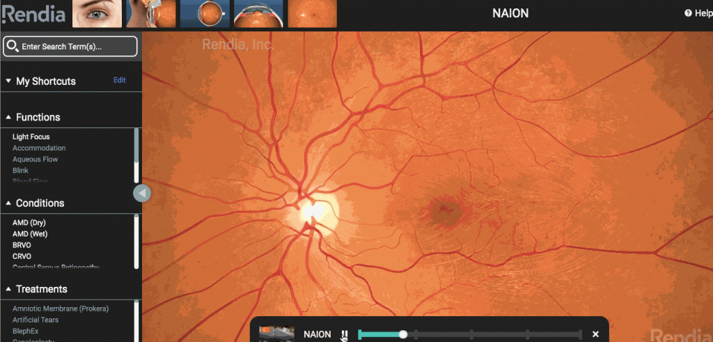 It’s essential for ophthalmologists to educate their patients on the optic nerve and the retina. Visual tools can help illustrate conditions like NAION to patients, help them understand the inner workings of the eye’s anatomy, and come to you when they experience any change or problem with their vision. Narrated animations can complement your explanations of conditions like NAION. Rendia’s Exam Mode can help illustrate these concepts:
